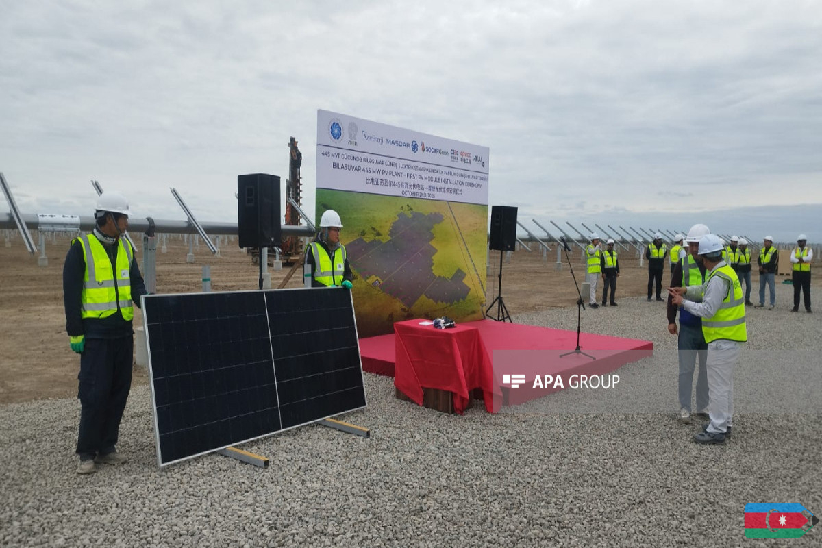 Gücü 445 MVt olacaq Biləsuvar Günəş Elektrik Stansiyasında ilk günəş panelinin quraşdırılması mərasimi keçirilib.