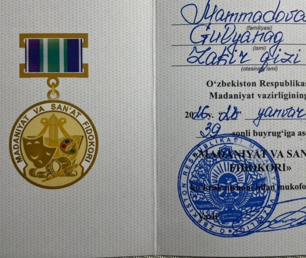 Tədbirə Özbəkistan dövləti tərəfindən fəxri qonaq kimi dəvət olunan Azərbaycan nümayəndəsi Gülyanaq Məmmədova mərasimdə iştirak edib. Mərasim Özbəkistan Respublikasının Mədəniyyət Nazirliyi tərəfindən təşkil olunmuşdur. Gülyanaq xanım Özbəkistan Respublikasının Mədəniyyət Nazirliyi tərəfindən iki ölkənin mədəniyyətinin inkişafında göstərdiyi xidmətə görə “Mədəniyyət və Sənət fədakarı” medalı ilə təltif olunmuşdur.